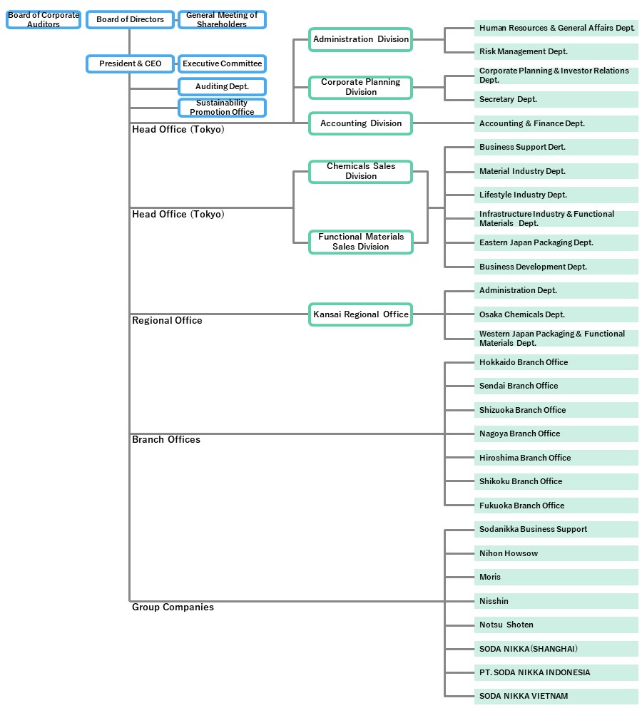 As a trading company specializing in chemical products, the Soda Nikka Group's fundamental management policy is to make contributions to the environment and in manufacturing, focusing on our core products, basic materials: inorganic chemicals, organic chemicals, and synthetic resin. To realize this goal, we strive to be active in market-oriented sales and build a dynamic and sound corporate structure.
