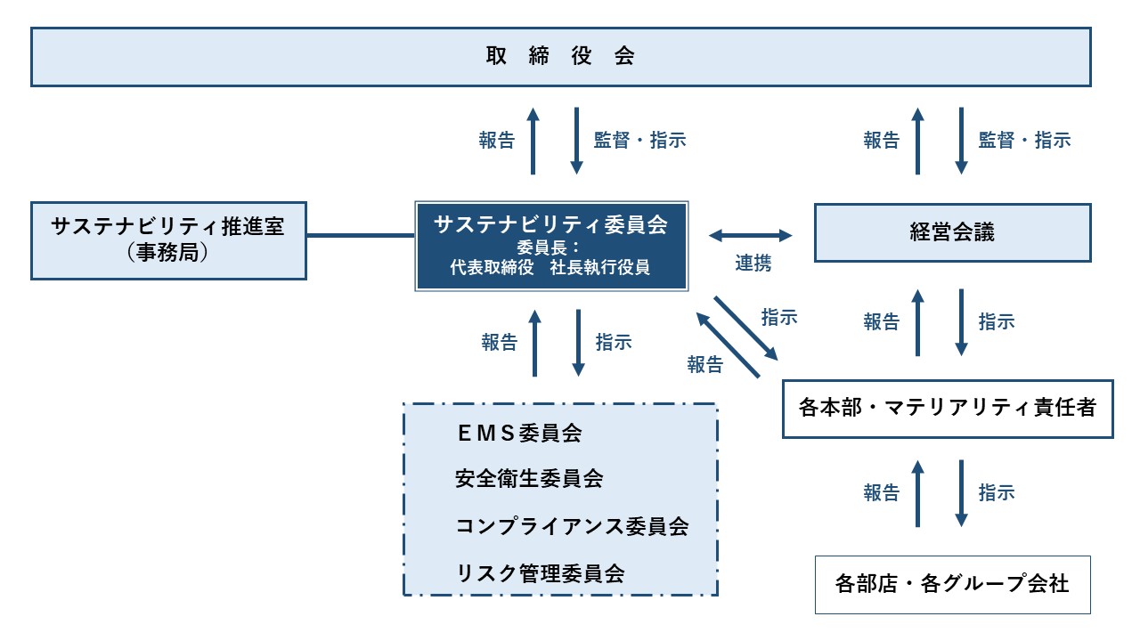 サステナビリティに関する取組みの基本方針や施策の審議・決定を行う機関として、「サステナビリティ委員会」を設置しております。サステナビリティ委員会は、代表取締役が統括し、経営会議メンバーを中心に構成しており、下部組織であるEMS委員会、安全衛生委員会、コンプライアンス委員会、リスク管理委員会からの報告を受け、それらを踏まえた上で気候変動を含むサステナビリティ課題の方針決定、施策の審議を行います。サステナビリティ委員会は月に一度開催し、検討・討議された内容は